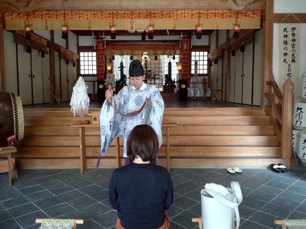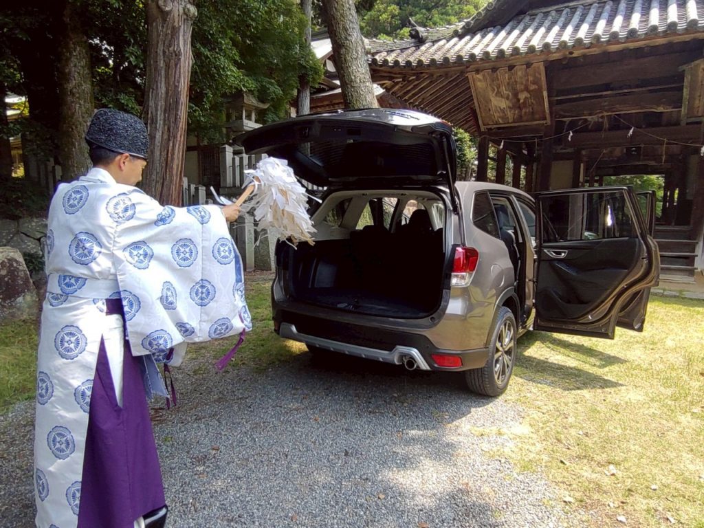 拝殿でのご祈祷後、一台一台祈念を込めて、車両をお祓いいたしております。